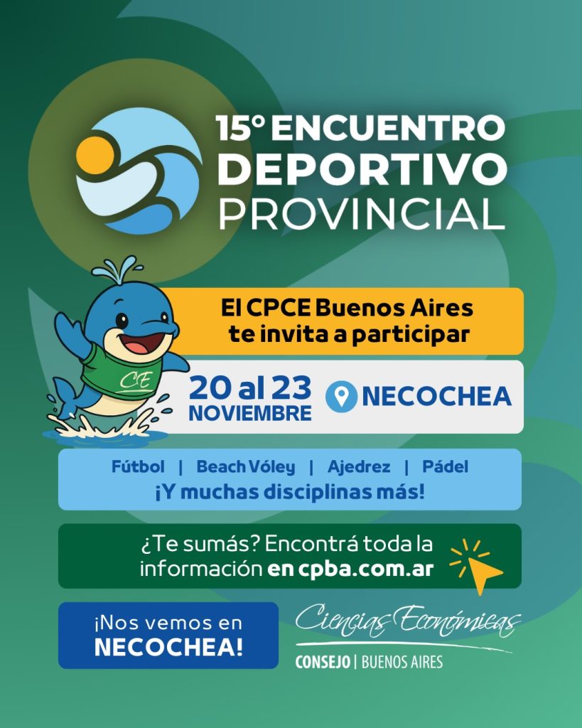 El Consejo Profesional de Ciencias Económicas de la Provincia de Buenos Aires invita a participar del 15° Encuentro Deportivo Provincial, a realizarse en la ciudad de Necochea del 20 al 23 de noviembre.