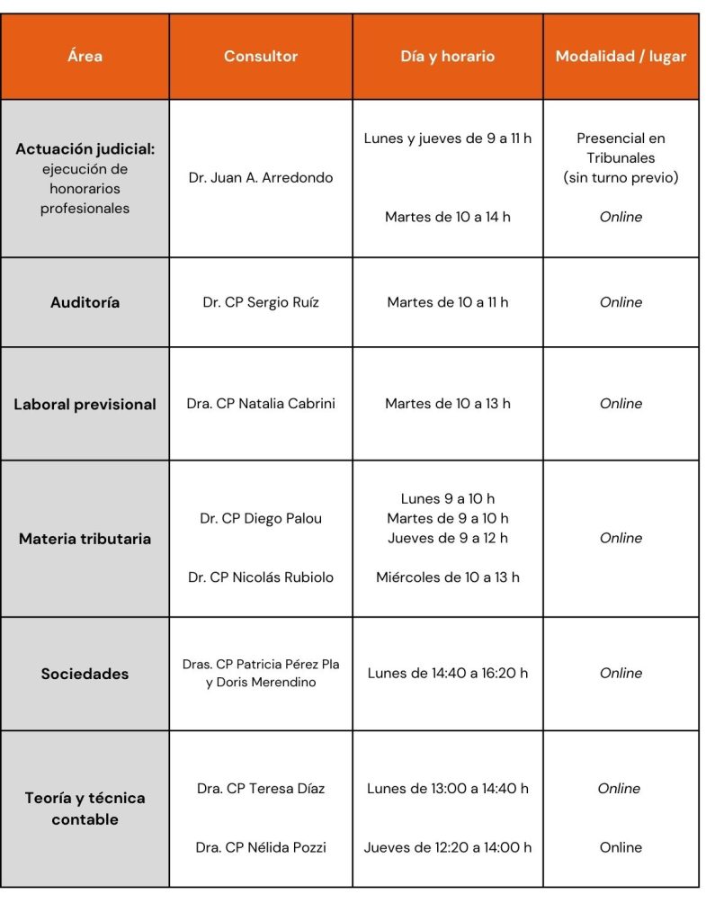 Sacá turno y asesorate en: actuación judicial, auditoría, laboral previsional, materia tributaria, sociedades, y teoría y técnica contable.