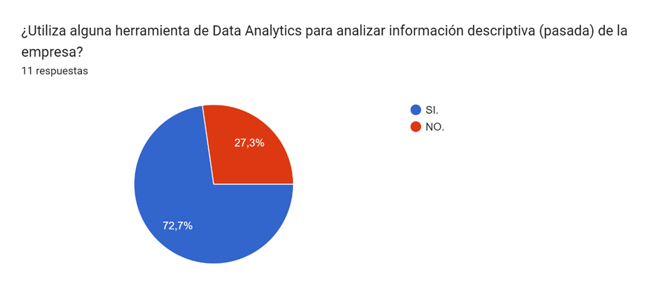 Esta información obtenida, si bien es preliminar, nos permite clarificar el estado de situación actual en las PyMEs. Un 88.9% tiene previsto recién en el mediano – largo plazo implementar herramientas de IA y un 94,4% NO utiliza herramientas actuales de análisis de datos para la toma de decisiones futuras.