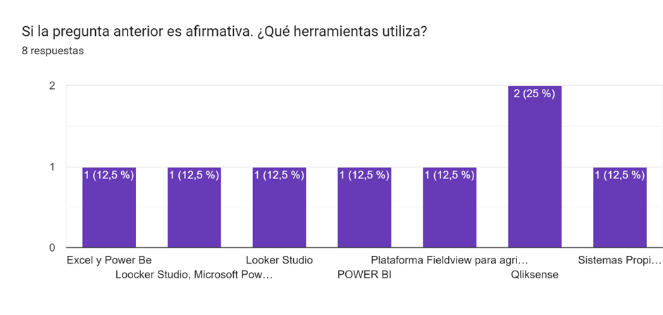 Podemos tomar estos datos como respuesta: la mayoría de las organizaciones utilizan herramientas de procesamiento y exposición de datos, y las utilizan para procesar datos financieros, información de clientes, ventas, control de stock, rendimiento de los colaboradores, entre otras. Ahora bien, entre las respuestas obtenidas, vemos que no se menciona ninguna herramienta o aplicación relacionada a la IA, o que trabaje con gran cantidad de datos y genere predicciones complejas o identifique patrones que luego puedan ser considerados para mejorar los indicadores que sí indican que se están midiendo.