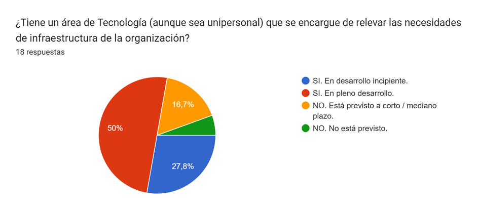 Vemos del primer gráfico que la mayoría de las organizaciones cuentan con un departamento dedicado exclusivamente al desarrollo y/o implementación de estas tecnologías, ya sea establecido o en desarrollo. De todos modos, existe un porcentaje que nuevamente no cuenta con este departamento y uno aún menor que no lo tiene planificado siquiera. Por otro lado, nos encontramos con que un 61,1% posee infraestructura desarrollada para soportar el análisis de datos, tanto descriptivo como predictivo y luego aplicarlo a la toma de decisiones. De esto surge un nuevo interrogante, ¿están estos procesos bien aplicados y cuentan con el conocimiento suficiente para explotar todo el potencial que ofrecen?